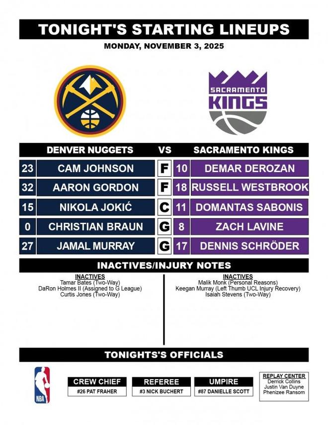 隨后,NBA官方公布兩隊首發(fā),按照NBA官方的對位關(guān)系以及國王官方的首發(fā)圖來看,確認(rèn)191cm的控球后衛(wèi)威斯布魯克將擔(dān)任國王隊本場比賽的首發(fā)大前鋒,這也是威斯布魯克職業(yè)生涯中首次以首發(fā)大前鋒的身份出戰(zhàn)。